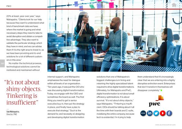163 solutions that one of Mahapatra ’ s biggest challenges is in hiring and retaining the highly specialized talent required to drive digital transformations . Ultimately , for Mahapatra and PwC , digital transformation is not about small efficiency optimizations . It is about survival . “ It ’ s not about shiny objects ,” says Mahapatra . “ Tinkering is insufficient . CIOs should be talking about it all the time with their boards and C-suite , mobilizing the entire company , because tech is existential . I ’ m trying to help them understand that it ’ s increasingly clear that we are entering into a highly disruptive extinction event . Enterprises that don ’ t transform themselves will disappear completely .”