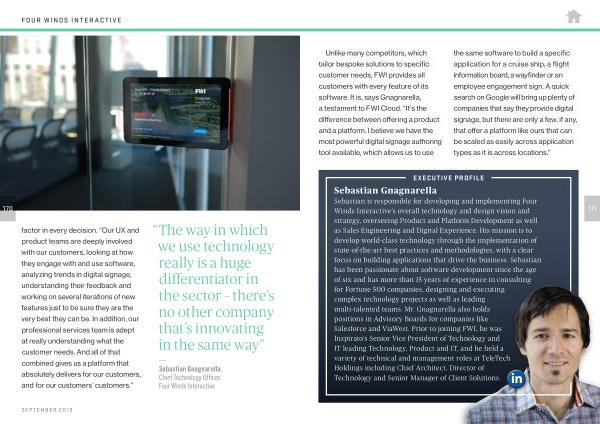 170 factor in every decision . “ Our UX and product teams are deeply involved with our customers , looking at how they engage with and use software , analyzing trends in digital signage , understanding their feedback and working on several iterations of new features just to be sure they are the very best they can be . In addition , our professional services team is adept at really understanding what the customer needs . And all of that combined gives us a platform that absolutely delivers for our customers , and for our customers ’ customers .”
