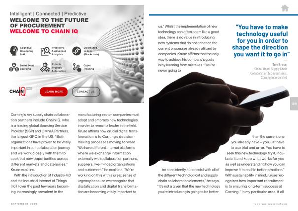 189 be consistently successful with all of the different technological and supply chain collaboration elements ,” he says . “ It ’ s not a given that the new technology you ’ re introducing is going to be better than the current one you already have – you just have to use trial and error . You have to seek this new technology , try it , incubate it and keep what works for you as well as understanding how you can improve it to enable better practices .” With sustainability in mind , Kruse recognizes how important recruitment is to ensuring long-term success at Corning . “ In my particular area , it all