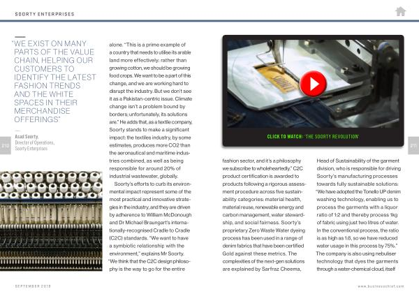 CLICK TO WATCH : ‘ THE SOORTY REVOLUTION ’ 211 fashion sector , and it ’ s a philosophy we subscribe to wholeheartedly .” C2C product certification is awarded to products following a rigorous assessment procedure across five sustainability categories : material health , material reuse , renewable energy and carbon management , water stewardship , and social fairness . Soorty ’ s proprietary Zero Waste Water dyeing process has been used in a range of denim fabrics that have been certified Gold against these metrics . The complexities of the next-gen solutions are explained by Sarfraz Cheema ,