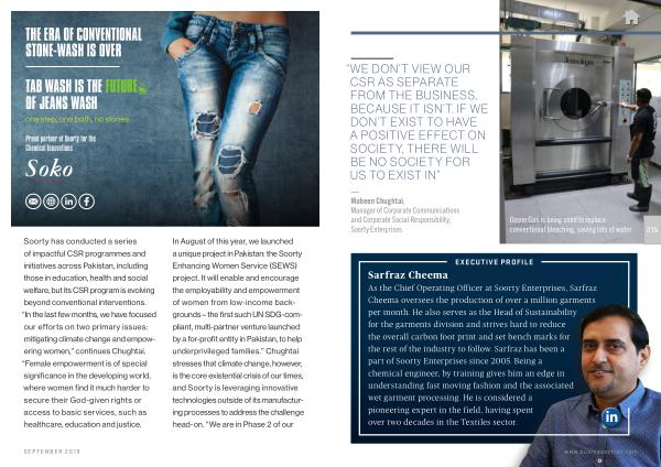 In August of this year , we launched a unique project in Pakistan : the Soorty Enhancing Women Service ( SEWS ) project . It will enable and encourage the employability and empowerment of women from low-income backgrounds – the first such UN SDG-compliant , multi-partner venture launched by a for-profit entity in Pakistan , to help underprivileged families .” Chughtai stresses that climate change , however , is the core existential crisis of our times , and Soorty is leveraging innovative technologies outside of its manufacturing processes to address the challenge head-on . “ We are in Phase 2 of our