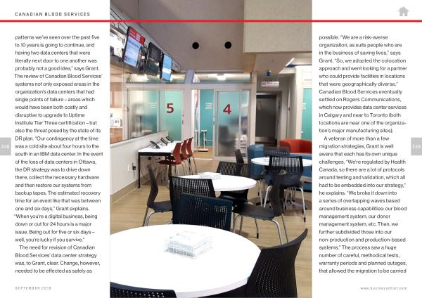 248 patterns we ’ ve seen over the past five to 10 years is going to continue , and having two data centers that were literally next door to one another was probably not a good idea ,” says Grant . The review of Canadian Blood Services ’ systems not only exposed areas in the organization ’ s data centers that had single points of failure – areas which would have been both costly and disruptive to upgrade to Uptime Institute Tier Three certification – but also the threat posed by the state of its DR plan . “ Our contingency at the time was a cold site about four hours to the south in an IBM data center . In the event of the loss of data centers in Ottawa , the DR strategy was to drive down there , collect the necessary hardware and then restore our systems from backup tapes . The estimated recovery time for an event like that was between one and six days ,” Grant explains . “ When you ’ re a digital business , being down or out for 24 hours is a major issue . Being out for five or six days – well , you ’ re lucky if you survive .”
