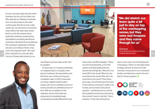 253 data center and DR strategies . “ When we were first doing this , a lot of the options and ideas getting thrown around were things like , ‘ Why don ’ t we move DR to the cloud ? Why don ’ t we move this to the cloud ? Why don ’ t we move that to the cloud ?’ Even three years ago , a lot of those services were in their infancy and weren ’ t really to be trusted , and certainly not by blood operator - somebody who is committed to patients and donors and saving lives wouldn ’ t want to risk that ,” Grant explains . “ In the intervening three years , we ’ ve seen a lot of development in that space . I think our next data center strategy will look at what we ’ re still running in-house and in our colocation facility , and determine what ’ s the next step for these systems .”