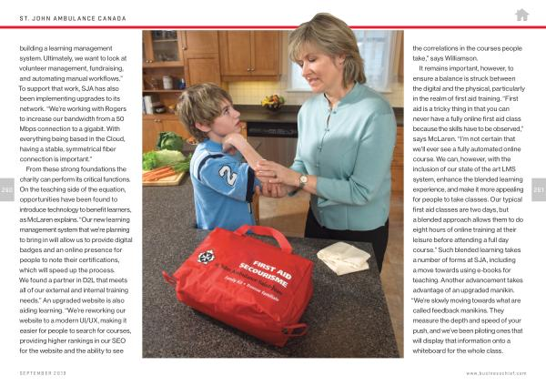 It remains important , however , to ensure a balance is struck between the digital and the physical , particularly in the realm of first aid training . “ First aid is a tricky thing in that you can never have a fully online first aid class because the skills have to be observed ,” says McLaren . “ I ’ m not certain that we ’ ll ever see a fully automated online course . We can , however , with the inclusion of our state of the art LMS system , enhance the blended learning experience , and make it more appealing for people to take classes . Our typical first aid classes are two days , but a blended approach allows them to do eight hours of online training at their leisure before attending a full day course .” Such blended learning takes a number of forms at SJA , including a move towards using e-books for teaching . Another advancement takes advantage of an upgraded manikin . “ We ’ re slowly moving towards what are called feedback manikins . They measure the depth and speed of your push , and we ’ ve been piloting ones that will display that information onto a whiteboard for the whole class .
